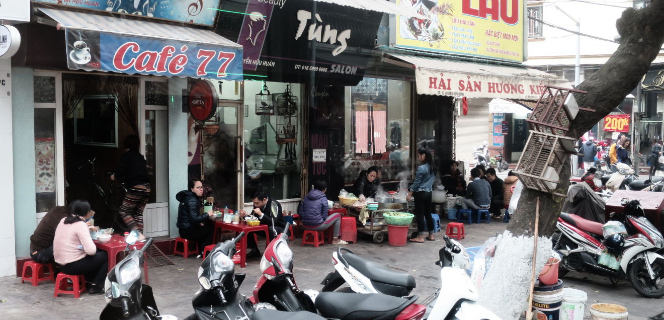 Pour se remonter le moral et se réchauffer, rien de tel qu'un bon café. Et là, pas de doute on est bien au Vietnam ! À tous les coins de rue on retrouve du monde occupé à boire le café et à papoter. Comme toujours, les gens sont assis sur ces minuscules tabourets en plastique, alignés le long du trottoir, partout où il y a un peu de place. Ces petits tabourets en plastique, c'est un peu le symbole du Vietnam, ils devraient figurer sur le drapeau. D'ailleurs la compagnie qui les fabrique a du faire fortune, il y a certainement autant de ces tabourets que d'habitants. Ça fait 90 millions quand même...