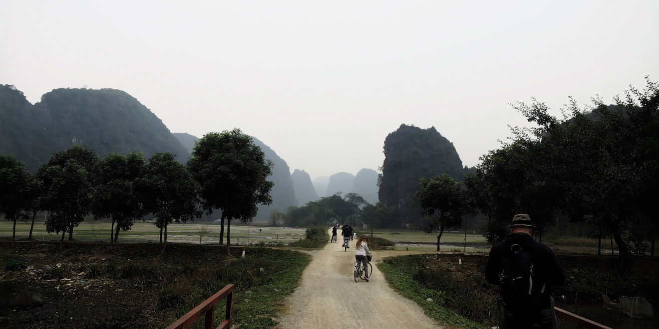 J'ai aussi fait un tour d'une journée avec un groupe, pour aller dans la province de Ninh Binh, un peu au sud de Hanoï. C'était super chouette. C'est une région assez plate, occupée de rizières, et hérissée de multiples "pain de sucre", c'est-à-dire des espèces de pythons rocheux quoi. On a fait du vélo dans les rizières, fait un tour de barque sur une petite rivière calme qui passait par des grottes. Et on a visité des temples (comme je vous ai dit, impossible d'y échapper).