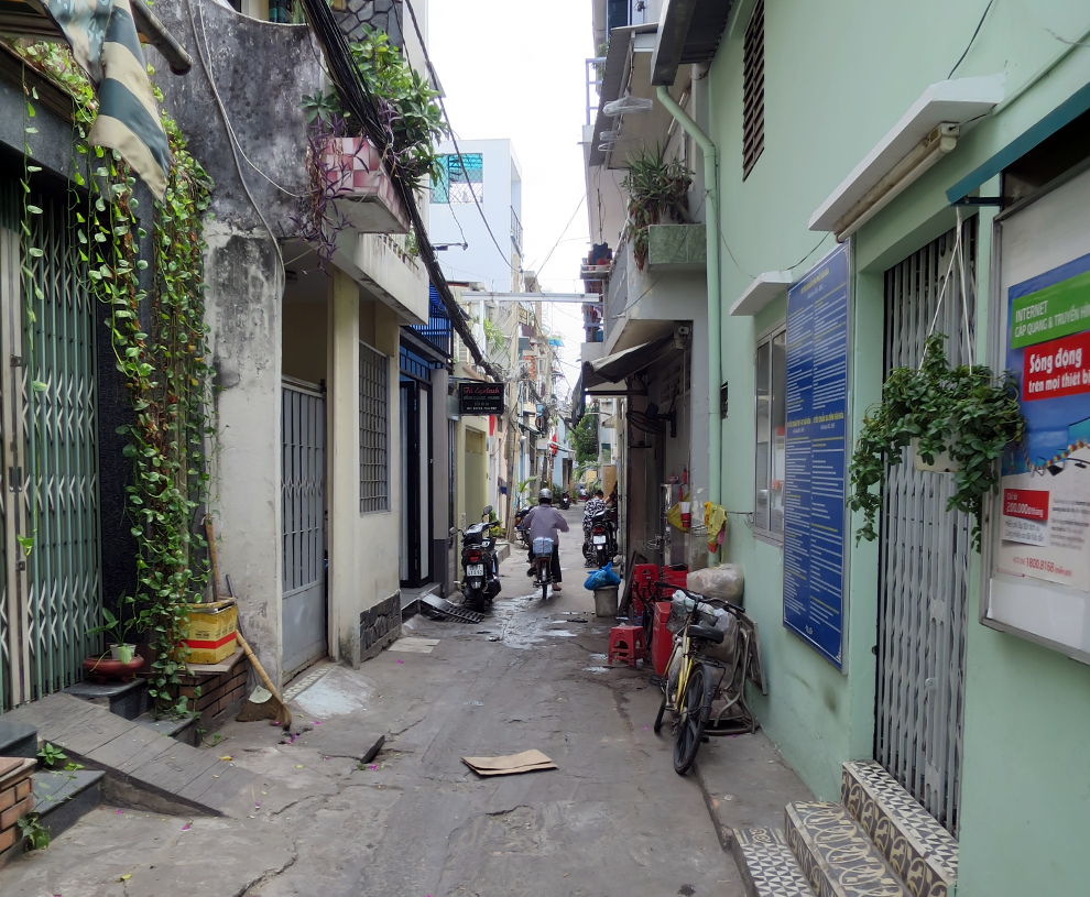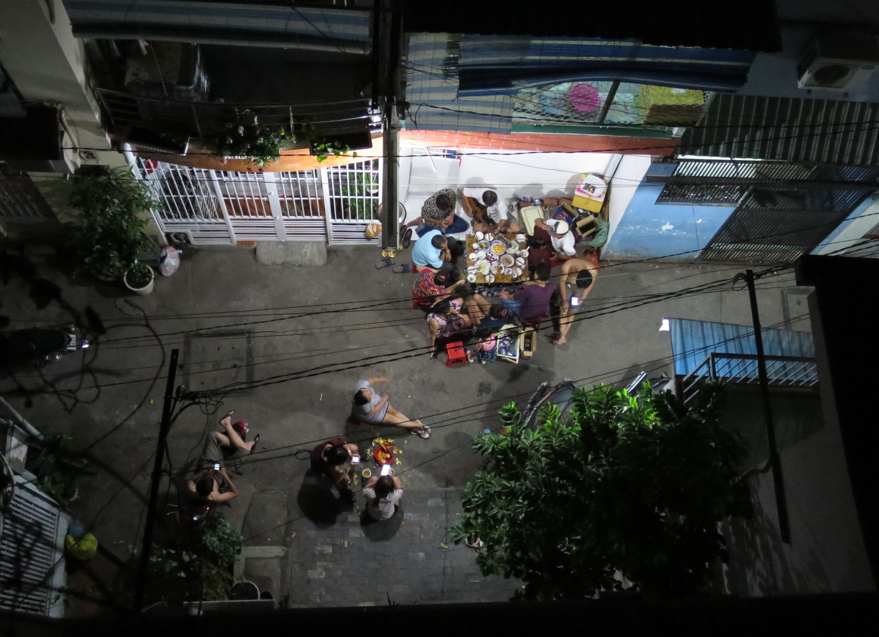 La baraque où j’habite est au calme. Pour y aller il faut prendre des petites rues et s'engouffrer dans des petits quartiers typiques de Saïgon. Des ruelles labyrinthiques, bétonnées, où ne passent pas les voitures. C'est chouette car du coup on s'éloigne des artères et on n'entend plus le bruit de la ville. C'est assez intime aussi. Les gens vivent un peu les uns sur les autres, et bien entendu y'a quasiment pas de jardins ou de cours. Donc les gens sortent les tables et tabourets (en plastique bleu ou rouge) dans la rue pour manger, boire un coup, jouer au cartes ou boire la café. C'est le genre de quartier où tout le monde sait tout sur tout, où la vie privée est publique, et où les potins doivent aller bon train. Enfin j'imagine, car bien entendu cette réalité reste hors de ma portée.