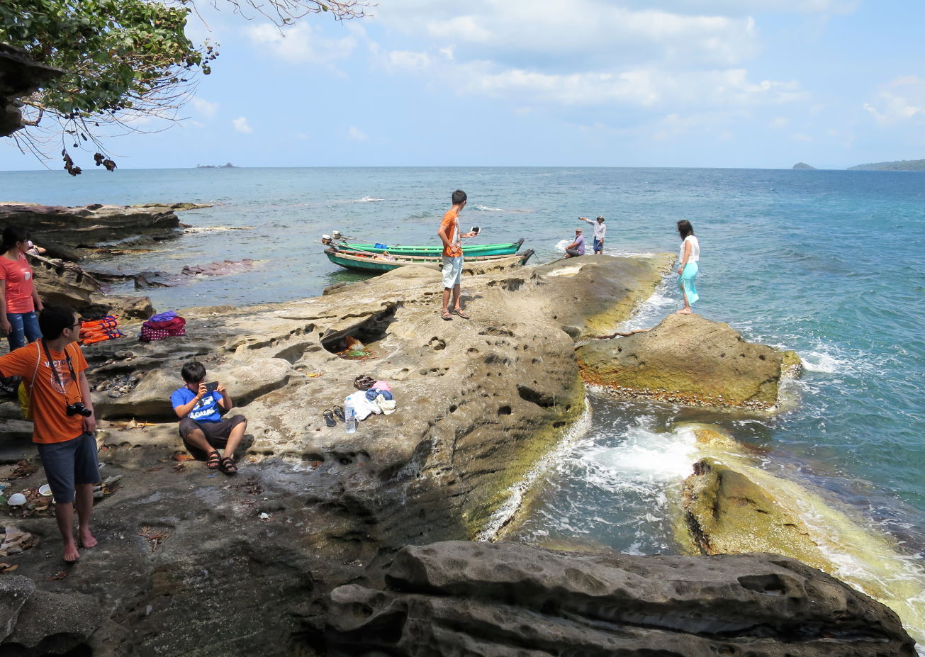Arrivés à Gành Dầu, on a pris des petites barques à moteur qui nous ont emmené un peu plus loin, dans une petite crique rocheuse inaccessible par la terre. De là, on voit les côtes cambodgiennes, de l'autre côté de la mer, au nord-ouest, à seulement 12 km si j'en crois Wikipedia. L'île de Phú Quốc est en réalité bien plus proche du Cambodge que du Vietnam.