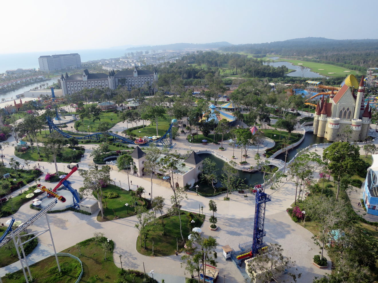 Après ça, on a fait les classiques de tous les parcs d'attraction: grande roue, montagnes russes, auto-tamponneuses, manège qui tourne très vite, etc etc... Et ensuite, on a été à la partie "Aqualand" du truc, car oui, ils ont aussi un genre d'Aqualand dans le parc. C'est grand. En fait le parc est le deuxième du nom, ça fait partie d'un gros groupe, c'est pas un parc d'attraction artisanale. Non non, c'est prévu pour accueillir le boum touristique imminent à Phú Quốc. Mais comme ce boum là n'est pas encore arrivé, et bien le parc est encore relativement vide, du coup c'est pas trop désagréable.