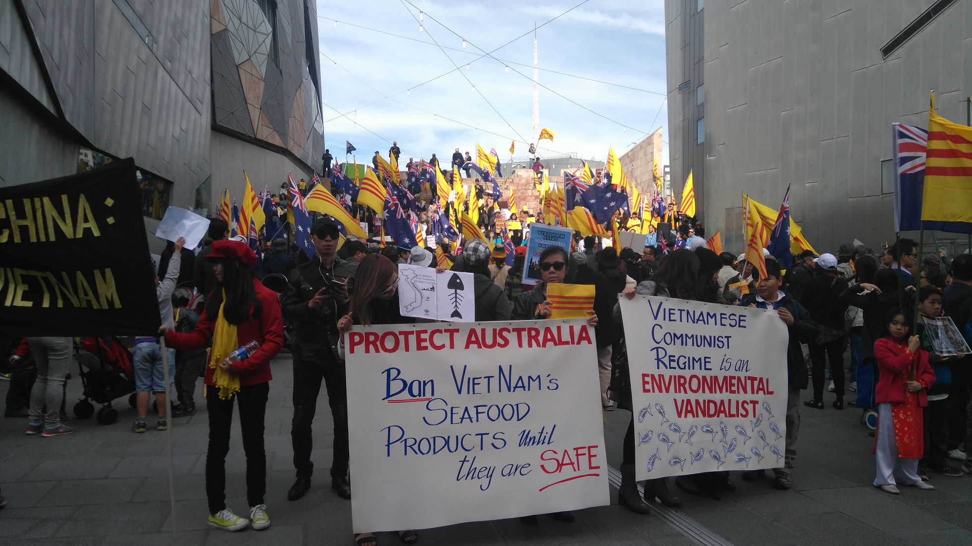 Je vous dis ça parce que je suis tombé aujourd'hui même sur une petite manif à Melbourne, visiblement organisée par la communauté Vietnamienne, pour dénoncer cette situation, et demander le boycott des produits de la mer en provenance du Vietnam.
